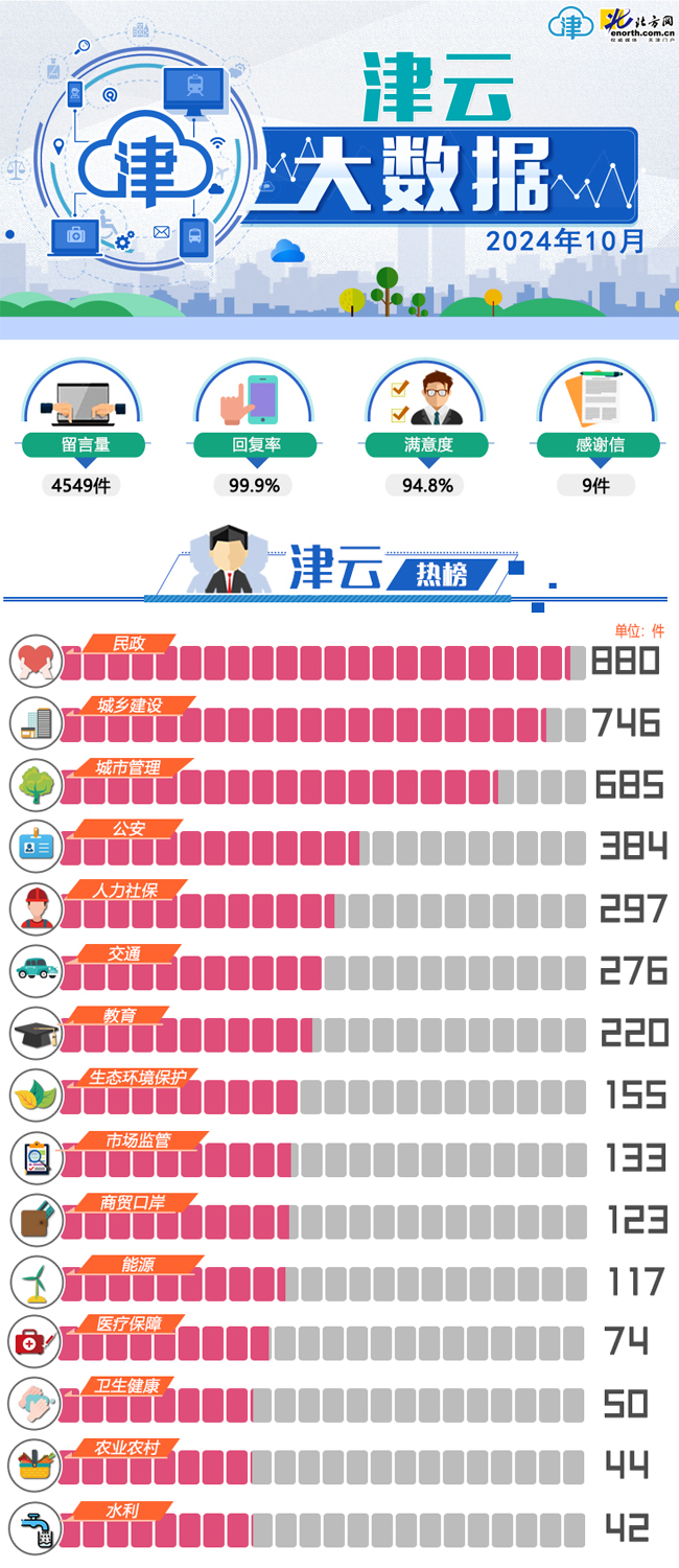 天津北方網訊:2024年10月份,《黨群心連心》和《政民零距離》兩個欄目共收到網民留言4549件,其中,投訴類留言1918件,諮詢類留1539件,求助類留言561件,建議類留言522件,反饋類留言9件。
