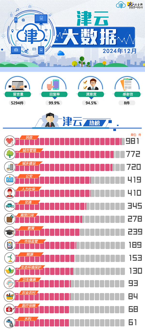 天津北方網訊:2024年12月份,《黨群心連心》和《政民零距離》兩個欄目共收到網民留言5294件,其中,諮詢類留言2074件,投訴類留1886件,求助類留言765件,建議類留言561件,反饋類留言8件。